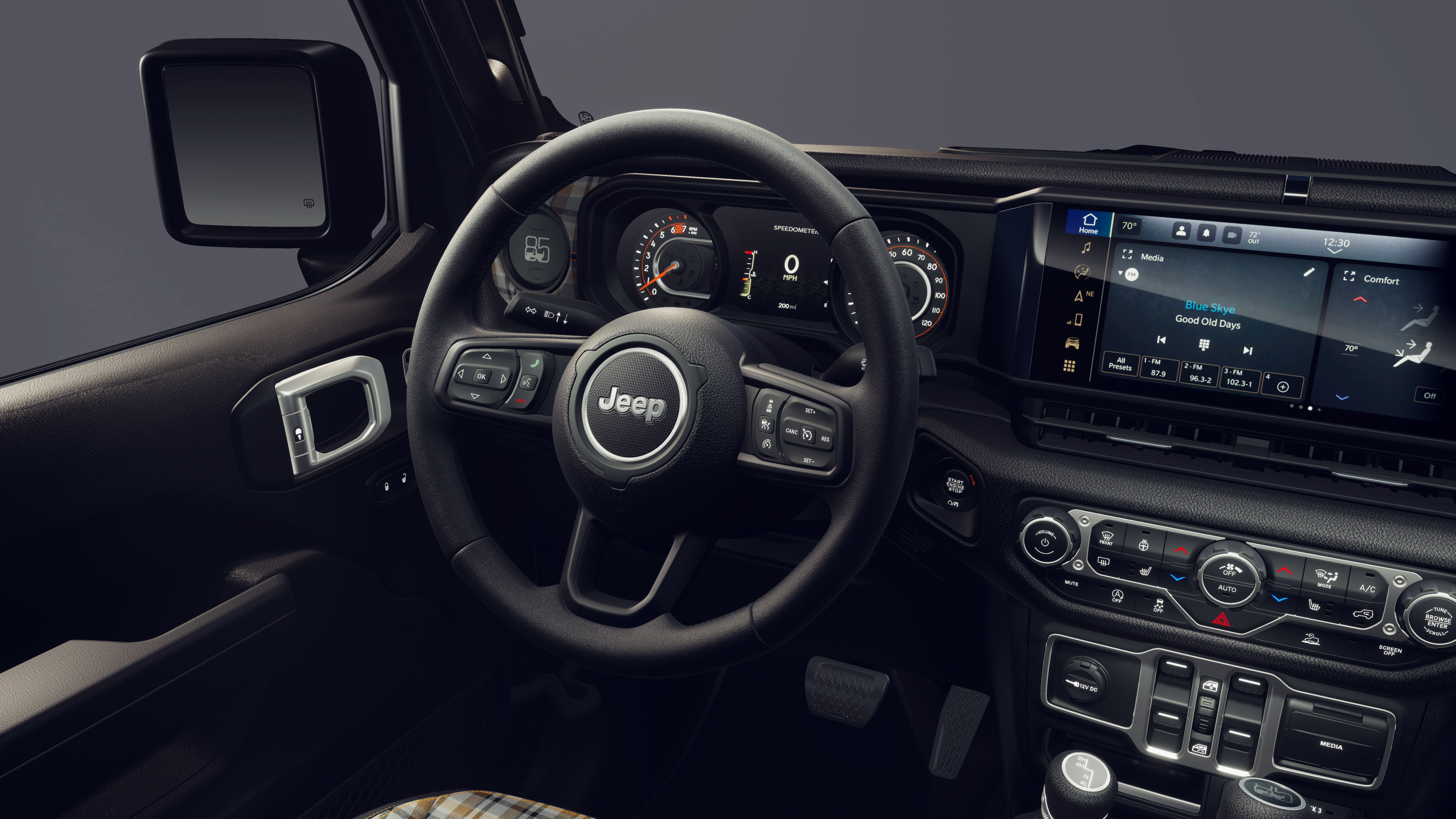 Trailer Tow and Auxiliary Switch Group (Auxiliary Switches, Class IV Receiver Hitch, Heavy-Duty Engine Cooling, and Trailer Hitch Zoom), 110 Mph Vehicle Max Speed Calibration, 12.3 Touchscreen Display, 3.73 Rear Axle Ratio, 4-Wheel Disc Brakes, 4G LTE Wi-Fi Hot Spot, 8 Speakers, ABS brakes, Air Conditioning, Alexa Built-in, AM/FM radio: SiriusXM with 360L, Apple CarPlay, Apple CarPlay/Android Auto, Body Color 3-Piece Hard Top, Brake assist, Compass, Connectivity - US/Canada, Delay-off headlights, Driver door bin, Driver vanity mirror, Dual front impact airbags, Dual front side impact airbags, Electronic Stability Control, For Details, Visit DriveUconnect.com, Freedom Panel Storage Bag, Front anti-roll bar, Front Bucket Seats, Front Center Armrest w/Storage, Front fog lights, Front reading lights, Google Android Auto, Illuminated entry, Integrated Center Stack Radio, Integrated roll-over protection, Low tire pressure warning, MOPAR Spray in Bedliner, MyFlexCare Service Plan, Normal Duty Suspension, Occupant sensing airbag, Outside temperature display, Overhead airbag, Panic alarm, ParkView Rear Back-Up Camera, Passenger door bin, Passenger vanity mirror, Power steering, Power windows, Radio data system, Radio: Uconnect 5 with 12.3 Display, Rear anti-roll bar, Rear reading lights, Rear Sliding Window, Rear Window Defroster, Remote keyless entry, SiriusXM Radio Service, SiriusXM with 360L, Speed control, Split folding rear seat, Steering wheel mounted audio controls, Tachometer, Telescoping steering wheel, Tilt steering wheel, Traction control, Trip computer, USB Host Flip, Variably intermittent wipers, Voltmeter, and Wheels: 17 x 7.5 Black Steel StyleD.