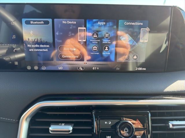 18 x 8J Alloy Wheels, 3rd row seats: split-bench, 4-Wheel Disc Brakes, 6 Speakers, ABS brakes, Air Conditioning, Alloy wheels, AM/FM radio: SiriusXM w/360L, Anti-whiplash front head restraints, Apple CarPlay/Android Auto, Auto High-beam Headlights, Auto-leveling suspension, Automatic temperature control, Brake assist, Bumpers: body-color, Carpeted Floor Mats with Bench Seat, Center Front Spoiler, Compass, Delay-off headlights, Driver door bin, Driver vanity mirror, Dual front impact airbags, Dual front side impact airbags, Electronic Stability Control, Emergency communication system: NissanConnect Services, Exterior Parking Camera Rear, Four wheel independent suspension, Front anti-roll bar, Front Bucket Seats, Front Center Armrest, Front dual zone A/C, Front reading lights, Fully automatic headlights, Garage door transmitter: myQ Connected Garage, HVAC memory, Illuminated entry, Knee airbag, Leather steering wheel, Leatherette Seat Trim, Low tire pressure warning, Occupant sensing airbag, Outside temperature display, Overhead airbag, Overhead console, Panic alarm, Passenger door bin, Passenger vanity mirror, Power door mirrors, Power driver seat, Power passenger seat, Power steering, Power windows, Premium Paint, Radio: NissanConnect with SiriusXM 360L, Rain sensing wipers, Rear air conditioning, Rear anti-roll bar, Rear reading lights, Rear seat center armrest, Rear window defroster, Rear window wiper, Reclining 3rd row seat, Remote keyless entry, Security system, Speed control, Speed-sensing steering, Speed-Sensitive Wipers, Splash Guards, Split folding rear seat, Spoiler, Steering wheel mounted audio controls, Tachometer, Telescoping steering wheel, Tilt steering wheel, Traction control, Trip computer, Variably intermittent wipers, and Voltmeter.