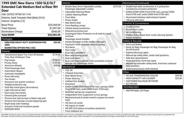Dark Toreador Red Metallic 1999 GMC Sierra 1500 SLE RWD 4-Speed Automatic with Overdrive Vortec 5.3L V8 SFI Vortec 5.3L V8 SFI, 4-Speed Automatic with Overdrive.