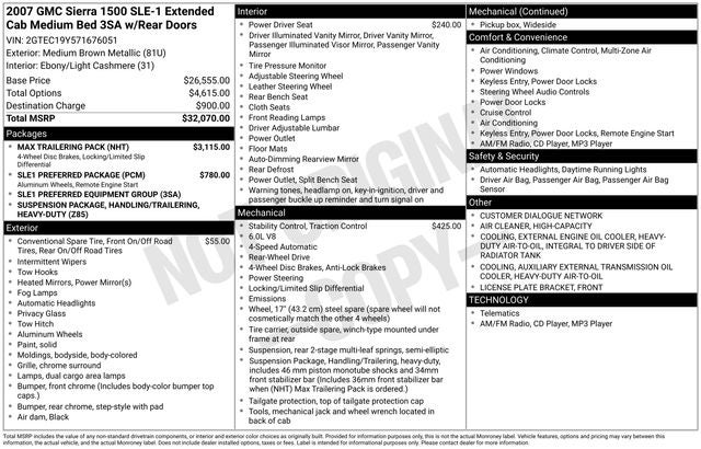 Clean CARFAX. Medium Brown Metallic 2007 GMC Sierra 1500 SLE1 RWD 4-Speed Automatic Super Duty Vortec 6.0L V8 SFI VVT Vortec 6.0L V8 SFI VVT, 4-Speed Automatic Super Duty, Ebony/Light Cashmere Cloth.