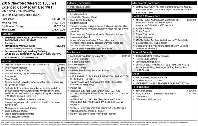 Preferred Equipment Group 1WT (150 Amp Alternator, 3-Passenger Full-Width Folding Rear Bench Seat, 6 Speaker Audio System, Chrome Grille Surround, Driver Information Center, Graphite-Colored Rubberized-Vinyl Floor Covering, Manual Tilt Wheel Steering Column, Power Windows w/Driver Express Up, and Solar Absorbing Tinted Glass), Trailering Package (Heavy-Duty Rear Locking Differential), 6-Speed Automatic Electronic with Overdrive, 4WD, Dark Ash/Jet Black Cloth, 3.42 Rear Axle Ratio, 4-Wheel Disc Brakes, 40/20/40 Front Split Bench Seat, 6 Speakers, ABS brakes, Air Conditioning, AM/FM radio, Black Power Adjustable Heated Outside Mirrors, Bluetooth® For Phone, Brake assist, Cloth Seat Trim, Deep-Tinted Glass, Delay-off headlights, Driver door bin, Dual front impact airbags, Dual front side impact airbags, E85 FlexFuel Capable, Electronic Stability Control, Front anti-roll bar, Front Center Armrest w/Storage, Front Chrome Bumper, Front License Plate Kit, Front reading lights, Front wheel independent suspension, Fully automatic headlights, Heavy Duty Suspension, High-Intensity Discharge Headlights, Low tire pressure warning, Occupant sensing airbag, OnStar 6 Months Guidance Plan, OnStar w/4G LTE, Overhead airbag, Overhead console, Passenger door bin, Passenger vanity mirror, Power steering, Power windows, Radio data system, Radio: AM/FM Stereo w/4.2 Diagonal Color Display, Radio: AM/FM w/7 Diagonal Color Touch Screen, Rear Bumper Cornersteps, Rear Chrome Bumper, Rear reading lights, Rear step bumper, Rear Vision Camera, Remote Keyless Entry, Remote Locking Tailgate, Speed control, Speed-sensing steering, Tachometer, Tilt steering wheel, Traction control, Trip computer, Variably intermittent wipers, Voltmeter, and Wheels: 17 x 8 Painted Steel. Recent Arrival! 6-Speed Automatic Electronic with Overdrive, 4WD, Dark Ash/Jet Black Cloth.2016 Chevrolet Silverado 1500 WT 4WD 6-Speed Automatic Electronic with Overdrive EcoTec3 4.3L V6 Silver Ice Metallic