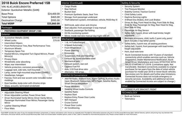 Discover the exceptional value of this 2018 Buick Encore Preferred, a compact SUV that delivers a remarkable blend of style, comfort, and advanced technology. Boasting a sleek Quicksilver Metallic exterior and a well-appointed interior, this Encore is ready to elevate your driving experience.