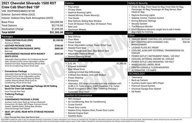 Elevate Your Drive with the Exceptional 2021 Chevrolet Silverado 1500 RSTDiscover the perfect blend of power, capability, and refined style with the 2021 Chevrolet Silverado 1500 RST. This impressive truck is ready to take on any challenge, whether you're tackling tough terrain, hauling heavy loads, or simply enjoying the open road.- Texas Edition Plus- Leather Package- Convenience Package with Bucket Seats- Trailer Brake Controller, Integrated- Premium Bose 7-Speaker Sound System- Wireless Phone Projection- Dual-Zone Automatic Climate Control- Keyless Open & Start- Heated Steering Wheel- Leather-Appointed Front Seat Trim- 20 Painted Aluminum WheelsUnder the hood, the Silverado 1500 RST boasts an EcoTec3 5.3L V8 engine, delivering an impressive 355 horsepower and 383 lb-ft of torque. Paired with an 8-speed automatic transmission and rear-wheel drive, this truck offers a dynamic and responsive driving experience. With an EPA-estimated 22 mpg on the highway, you can enjoy the power you need without sacrificing efficiency.The exterior of the Silverado 1500 RST exudes a bold and confident presence, thanks to its White paint, body-colored grille, and striking 20-inch aluminum wheels. The Texas Edition Plus package adds even more style with its unique badging and high-gloss black mirror caps.Step inside the cabin, and you'll be greeted by a wealth of premium features. The Leather Package enhances the interior with luxurious leather-appointed seats, while the Convenience Package with Bucket Seats provides added comfort and convenience with features like heated front seats, a heated steering wheel, and a 10-way power driver's seat.The Silverado 1500 RST also boasts an impressive array of technology, including the Chevrolet Infotainment 3 Plus system with a 8-inch touchscreen, wireless phone projection, and a premium Bose 7-speaker sound system. Stay connected and entertained on every journey.Whether you're tackling tough jobs or seeking a capable and well-equipped daily driver, the 2021 Chevrolet Silverado 1500 RST is the perfect choice. Experience the power, style, and versatility that this remarkable truck has to offer.This vehicle is located at Navarre Chevrolet, 1300 East College Street, Lake Charles, LA 70607. Please call any of our Sales Professionals at 337-474-1999 for more details or to set an appointment.Visit our website http://www.navarreauto.com for more New, Pre-Owned, and Chevrolet Certified Specials!