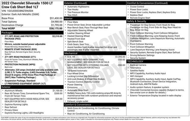 Convenience Package (10-Way Power Driver Seat w/Lumbar, 120-Volt Bed Mounted Power Outlet, 120-Volt Instrument Panel Power Outlet, Dual Rear USB Ports (Charge Only), Dual-Zone Automatic Climate Control, Heated Driver & Front Outboard Passenger Seats, Heated Steering Wheel, Keyless Open & Start, Leather Wrapped Steering Wheel, and Manual Tilt/Telescoping Steering Column), Preferred Equipment Group 1LT (12.3 Multicolor Reconfigurable Digital Display, All-Star Edition, Auto-Locking Rear Differential, Bluetooth® For Phone, Chevrolet Connected Access Capable, Chrome Mirror Caps, Color-Keyed Carpeting Floor Covering, Compass, Deep-Tinted Glass, Electrical Steering Column Lock, Electronic Cruise Control, EZ Lift Power Lock & Release Tailgate, Front Frame-Mounted Black Recovery Hooks, Front Rubberized Vinyl Floor Mats, HD Rear Vision Camera, Heated Power-Adjustable Outside Mirrors, Inside Rear-View Mirror w/Tilt, LED Cargo Area Lighting, OnStar & Chevrolet Connected Services Capable, Power Front Windows w/Driver Express Up/Down, Power Front Windows w/Passenger Express Down, Power Rear Windows w/Express Down, Rear 60/40 Folding Bench Seat (Folds Up), Rear Rubberized-Vinyl Floor Mats, SiriusXM w/360L, Standard Tailgate, Steering Wheel Audio Controls, Wi-Fi Hot Spot Capable, and Wireless Phone Projection), Protection Package (Chevytec Spray-On Black Bedliner and Rear Wheelhouse Liners), Remote Start Package (Electric Rear-Window Defogger, Remote Vehicle Starter System, and Theft Deterrent System (Unauthorized Entry)), Standard Suspension Package, Trailering Package (Hitch Guidance), Z71 Off-Road & Protection Package (All-Weather Floor Liner (LPO) (AAK)), Z71 Off-Road Package (Dual Exhaust w/Polished Outlets, Heavy-Duty Air Filter, Hill Descent Control, Off-Road Suspension, and Wheels: 18 x 8.5 Bright Silver Painted Aluminum), 10-Speed Automatic, 4WD, Jet Black Cloth, 170 Amp Alternator, 220 Amp Alternator, 3.23 Rear Axle Ratio, 4-Wheel Disc Brakes, 40/20/40 Front Split-Bench Seat, 6 Speakers, 6-Speaker Audio System, ABS brakes, Air Conditioning, Alloy wheels, AM/FM radio: SiriusXM with 360L, Apple CarPlay/Android Auto, Auto High-beam Headlights, Automatic Emergency Braking, Automatic temperature control, Auxiliary External Transmission Oil Cooler, Brake assist, Bumpers: chrome, Cloth Seat Trim, Delay-off headlights, Driver door bin, Driver vanity mirror, Dual front impact airbags, Dual front side impact airbags, Electronic Stability Control, External Engine Oil Cooler, Following Distance Indicator, Forward Collision Alert, Front anti-roll bar, Front Center Armrest w/Storage, Front dual zone A/C, Front License Plate Kit, Front Pedestrian Braking, Front reading lights, Front wheel independent suspension, Fully automatic headlights, Heated door mirrors, Heated front seats, Heated steering wheel, Illuminated entry, IntelliBeam Automatic High Beam On/Off, Lane Keep Assist w/Lane Departure Warning, Low tire pressure warning, Not Equipped w/Dynamic Fuel Management, Not Equipped w/Hood Insulator, Not Equipped w/Steering Column Lock, Occupant sensing airbag, Outside temperature display, Overhead airbag, Overhead console, Panic alarm, Passenger door bin, Passenger vanity mirror, Power door mirrors, Power driver seat, Power steering, Power windows, Premium audio system: Chevrolet Infotainment 3 Premium, Radio data system, Radio: Chevrolet Infotainment 3 Premium System, Rear reading lights, Rear step bumper, Rear window defroster, Remote keyless entry, Security system, Speed control, Speed-sensing steering, Split folding rear seat, Steering wheel mounted audio controls, Tachometer, Telescoping steering wheel, Tilt steering wheel, Traction control, Trip computer, Variably intermittent wipers, Voltmeter, Wheels: 17 x 8 Bright Silver Painted Aluminum, and Wheels: 20 x 9 Painted Aluminum. Recent Arrival! 10-Speed Automatic, 4WD, Jet Black Cloth.