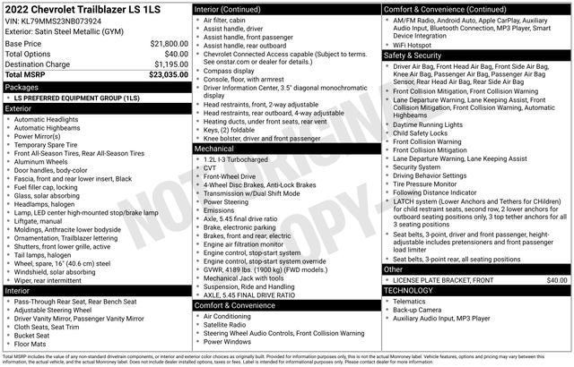 CARFAX One-Owner. Satin Steel Metallic 2022 Chevrolet TrailBlazer LS FWD CVT 1.2L Ecotec Turbo DOHC DI w/VVT