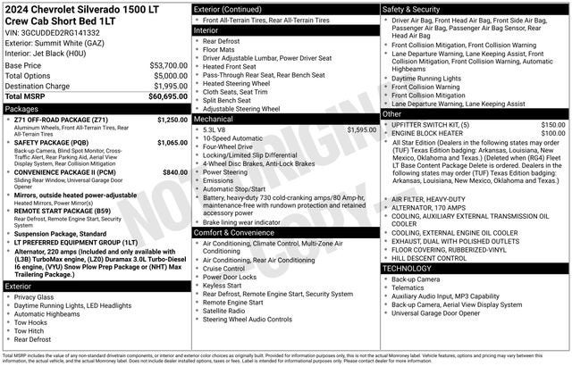 Convenience Package (10-Way Power Driver Seat w/Lumbar, 120-Volt Bed Mounted Power Outlet, 120-Volt Interior Power Outlet, Dual Rear USB Ports (Charge Only), Dual-Zone Automatic Climate Control, Heated Driver & Front Outboard Passenger Seats, Heated Steering Wheel, Keyless Open & Start, and Wrapped Steering Wheel), Convenience Package II (Hitch Guidance w/Hitch View, In-Vehicle Trailering System App, Integrated Trailer Brake Controller, Power Sliding Rear Window w/Rear Defogger, and Universal Home Remote), Preferred Equipment Group 1LT (12.3 Multicolor Reconfigurable Digital Display, All-Star Edition, Auto-Locking Rear Differential, Bluetooth® For Phone, Chevrolet Connected Access Capable, Chrome Mirror Caps, Color-Keyed Carpeting Floor Covering, Deep-Tinted Glass, Electrical Steering Column Lock, Electronic Cruise Control, EZ Lift Power Lock & Release Tailgate, Front Frame-Mounted Black Recovery Hooks, Front Rubberized Vinyl Floor Mats, HD Rear Vision Camera, Heated Power-Adjustable Outside Mirrors, Inside Rear-View Mirror w/Tilt, LED Cargo Area Lighting, OnStar & Chevrolet Connected Services Capable, Power Front Windows w/Driver Express Up/Down, Power Front Windows w/Passenger Express Down, Power Rear Windows w/Express Down, Rear 60/40 Folding Bench Seat (Folds Up), Rear Rubberized-Vinyl Floor Mats, SiriusXM w/360L, Standard Tailgate, Steering Wheel Audio Controls, and Wi-Fi Hot Spot Capable), Remote Start Package (Electric Rear-Window Defogger, Remote Vehicle Starter System, and Theft Deterrent System (Unauthorized Entry)), Safety Package (HD Surround Vision, Perimeter Lighting, Rear Cross Traffic Braking, Rear Pedestrian Alert, Trailer Camera Provisions, Trailer Side Blind Zone Alert, and Ultrasonic Front & Rear Park Assist), Standard Suspension Package, Trailering Package (Hitch Guidance), Z71 Off-Road Package (Dual Exhaust w/Polished Outlets, Heavy-Duty Air Filter, Hill Descent Control, Off-Road Suspension, and Wheels: 18 x 8.5 Bright Silver Painted Aluminum), 10-Speed Automatic, 4WD, Jet Black Cloth, 170 Amp Alternator, 220 Amp Alternator, 3.23 Rear Axle Ratio, 4-Wheel Disc Brakes, 40/20/40 Front Split-Bench Seat, 6 Speakers, 6-Speaker Audio System, ABS brakes, Air Conditioning, Alloy wheels, AM/FM radio: SiriusXM with 360L, Auto High-beam Headlights, Automatic Emergency Braking, Automatic temperature control, Auxiliary External Transmission Oil Cooler, Brake assist, Bumpers: chrome, Cloth Seat Trim, Compass, Delay-off headlights, Driver door bin, Driver vanity mirror, Dual front impact airbags, Dual front side impact airbags, Electronic Stability Control, Engine Block Heater, External Engine Oil Cooler, Following Distance Indicator, Forward Collision Alert, Front anti-roll bar, Front Center Armrest w/Storage, Front dual zone A/C, Front License Plate Kit, Front Pedestrian Braking, Front reading lights, Front wheel independent suspension, Fully automatic headlights, Heated door mirrors, Heated front seats, Heated steering wheel, Illuminated entry, IntelliBeam Automatic High Beam On/Off, Lane Keep Assist w/Lane Departure Warning, Low tire pressure warning, Occupant sensing airbag, Outside temperature display, Overhead airbag, Overhead console, Panic alarm, Passenger door bin, Passenger vanity mirror, Power door mirrors, Power driver seat, Power steering, Power windows, Premium audio system: Chevrolet Infotainment 3 Premium, Radio data system, Radio: Chevrolet Infotainment 3 Premium System, Rear reading lights, Rear step bumper, Rear window defroster, Remote keyless entry, Rubberized-Vinyl Floor Covering, Security system, Speed control, Speed-sensing steering, Split folding rear seat, Steering wheel mounted audio controls, Tachometer, Telescoping steering wheel, Tilt steering wheel, Traction control, Trip computer, Variably intermittent wipers, Voltmeter, and Wheels: 17 x 8 Bright Silver Painted Aluminum. Recent Arrival! 10-Speed Automatic, 4WD, Jet Black Cloth.