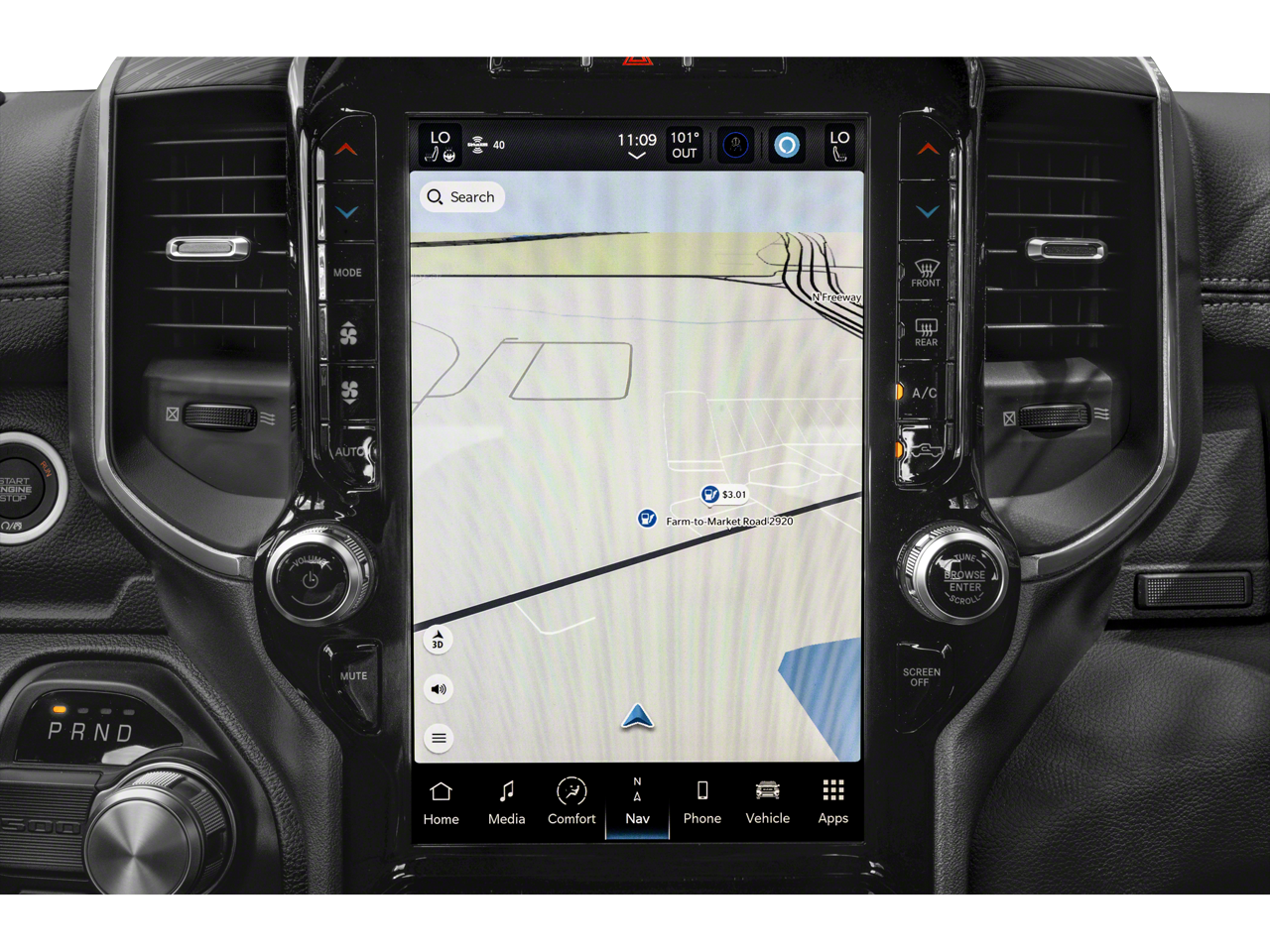 10 Speakers, 3 Rear Seat Head Restraints, 3.21 Rear Axle Ratio, 4 Way Front Headrests, 4-Wheel Disc Brakes, 48V Belt Starter Generator, 4G LTE Wi-Fi Hot Spot, ABS brakes, Air Conditioning, Alloy wheels, AM/FM radio: SiriusXM with 360L, Apple CarPlay, Apple CarPlay/Android Auto, Audio memory, Auto-dimming door mirrors, Auto-Dimming Exterior Driver Mirror, Auto-dimming Rear-View mirror, Automatic temperature control, Brake assist, Bumpers: chrome, Chrome Exterior Mirrors, Compass, Connected Travel & Traffic Services, Connectivity - US/Canada, Convex Wide-Angle Exterior Mirror Insert, Delay-off headlights, Driver door bin, Driver Seat Memory, Driver vanity mirror, Dual front impact airbags, Dual front side impact airbags, Electronic Stability Control, Exterior Mirrors Courtesy Lamps, Exterior Mirrors w/Heating Element, Exterior Mirrors w/Memory, Exterior Mirrors w/Supplemental Signals, Exterior Parking Camera Rear, For Details, Visit DriveUconnect.com, For More Info, Call 800-643-2112, Front anti-roll bar, Front Center Armrest w/Storage, Front dual zone A/C, Front fog lights, Front reading lights, Front Seat Back Map Pockets, Front wheel independent suspension, Fully automatic headlights, Garage door transmitter, Global Telematics Box Module (TBM), Google Android Auto, GPS Navigation, HD Radio, Heated door mirrors, Heated Front Seats, Heated front seats, Heated Steering Wheel, Heated steering wheel, Illuminated entry, Integrated Voice Command w/Bluetooth®, Leather steering wheel, Leather Trim 40/20/40 Bench Seat, Low tire pressure warning, Memory seat, Navigation System, Occupant sensing airbag, Outside temperature display, Overhead airbag, Overhead console, Panic alarm, Passenger door bin, Passenger vanity mirror, Power 2-Way Driver Lumbar Adjust, Power 2-Way Passenger Lumbar Adjust, Power 8-Way Driver & Passenger Seats, Power door mirrors, Power driver seat, Power passenger seat, Power steering, Power windows, Power-Folding Mirrors, Radio data system, Radio: Uconnect 5 Nav w/8.4 Display, RAM Grille Badge - Chrome, Rear 60/40 Folding Seat, Rear anti-roll bar, Rear seat center armrest, Rear step bumper, Remote keyless entry, Security system, SiriusXM Radio Service, SiriusXM w/360L, Speed control, Split folding rear seat, Steering wheel mounted audio controls, Tachometer, Telescoping steering wheel, Tilt steering wheel, Traction control, Trip computer, Turn signal indicator mirrors, Variably intermittent wipers, Ventilated Front Seats, Ventilated front seats, Voltmeter, and Wheels: 18 x 8 Aluminum Base PainteD.